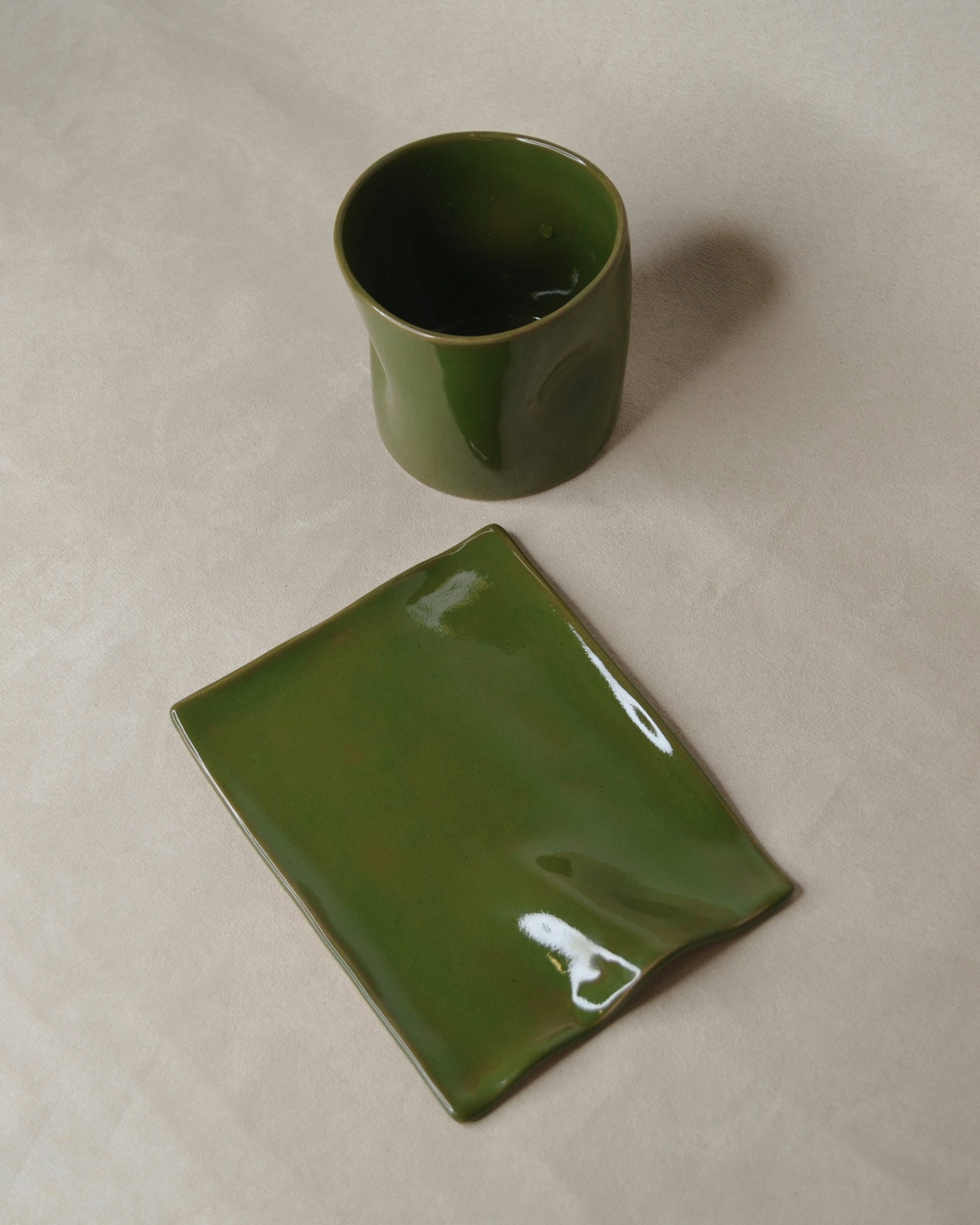 Set of ceramic mug and small plate in olive color. Perfect for your hot or cold beverages.