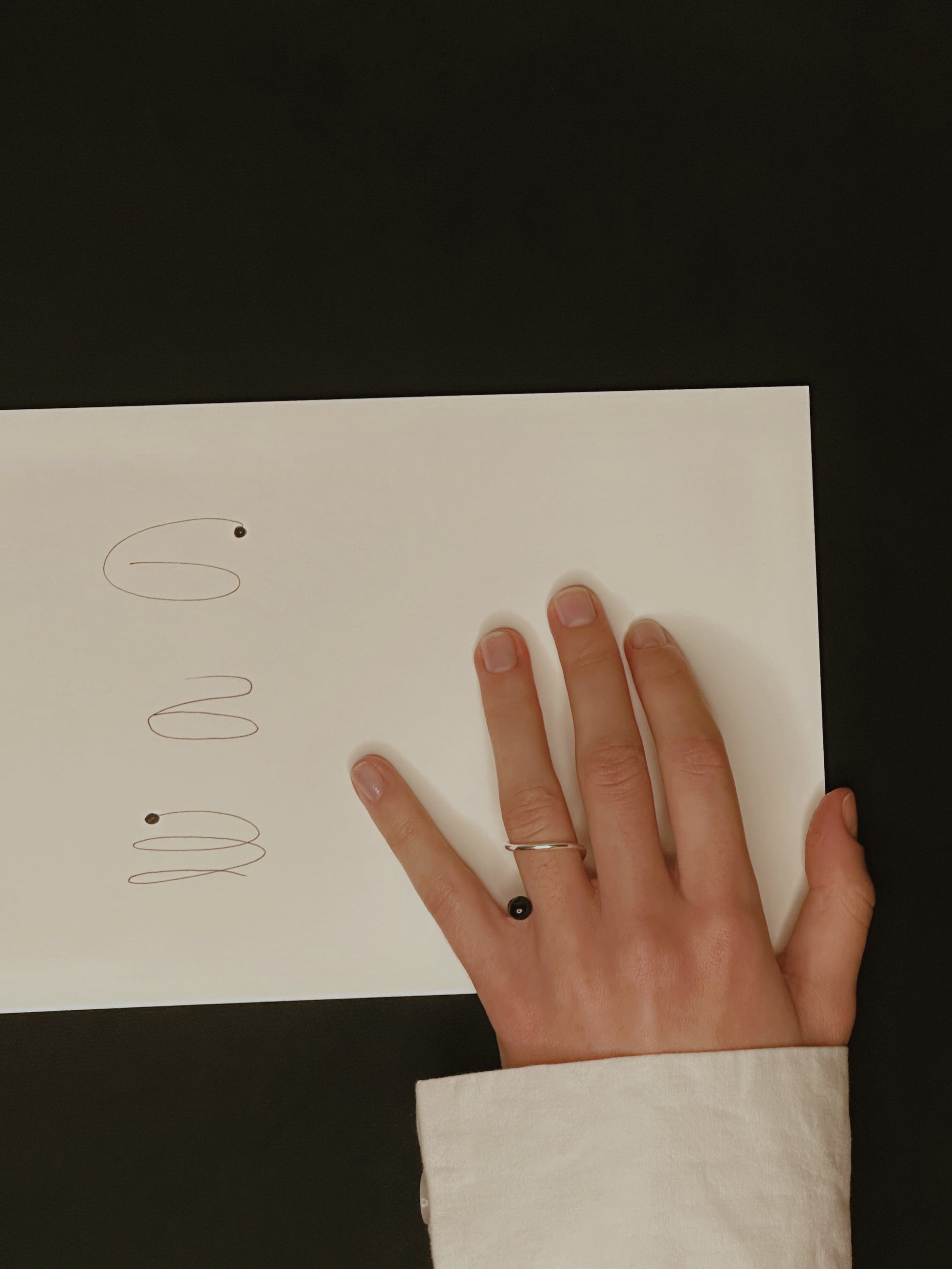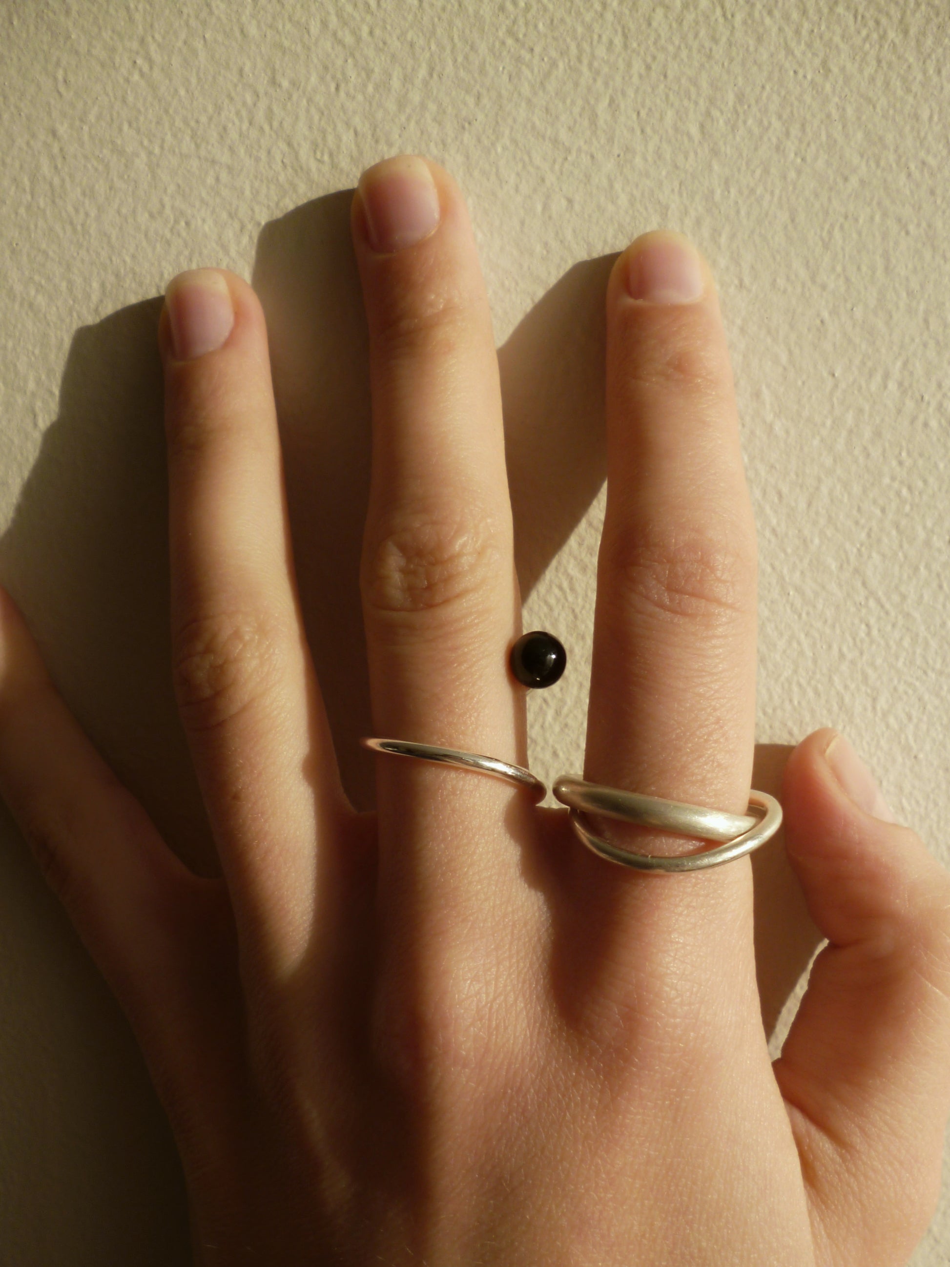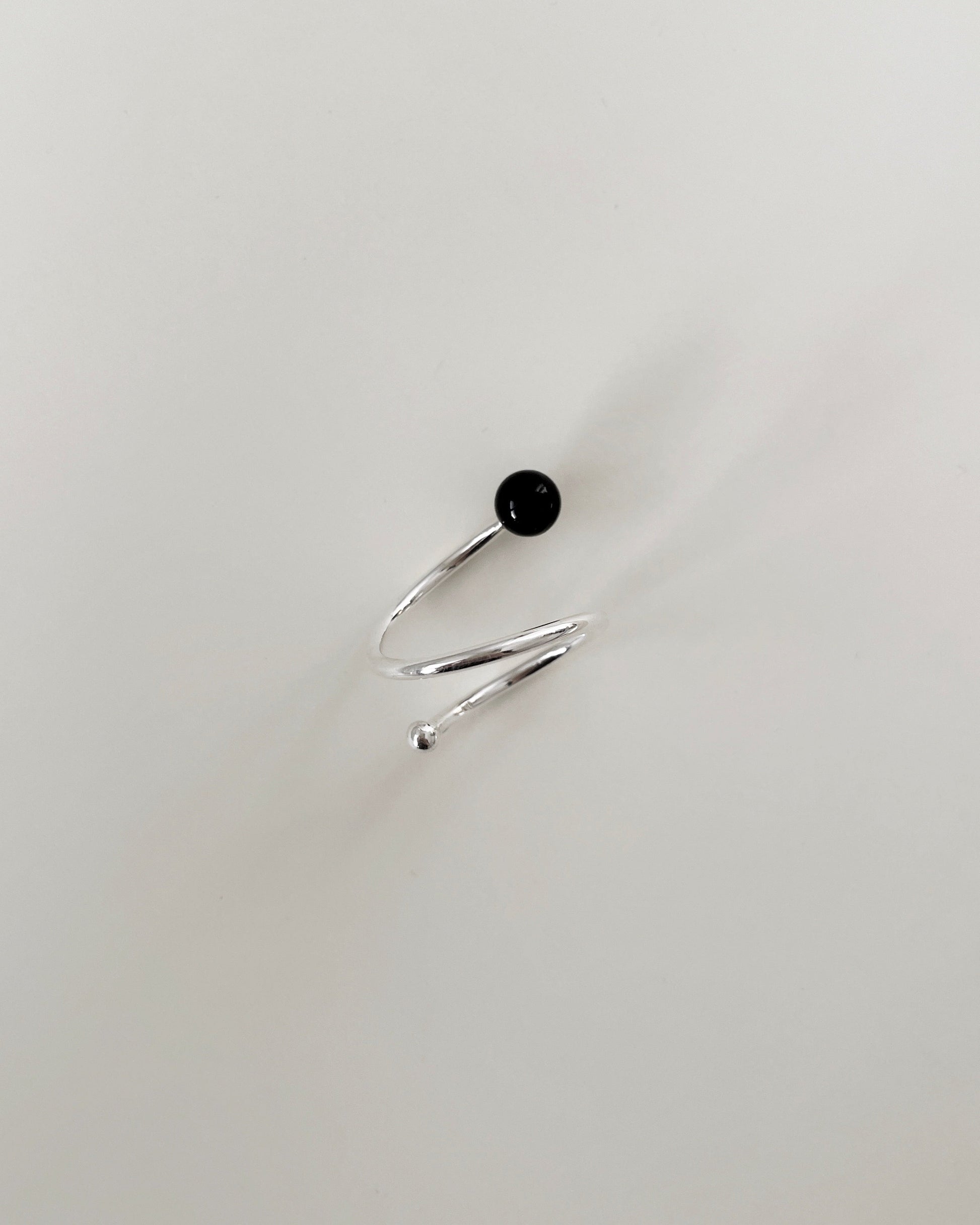 "Encircle" meaning surround - the ring forms a circle around your finger with a glimpse of onyx stone. Part of a collection inspired by Croisière by A. Calder, it reflects the interplay of spheres, curves, and the interconnectedness of its elements.