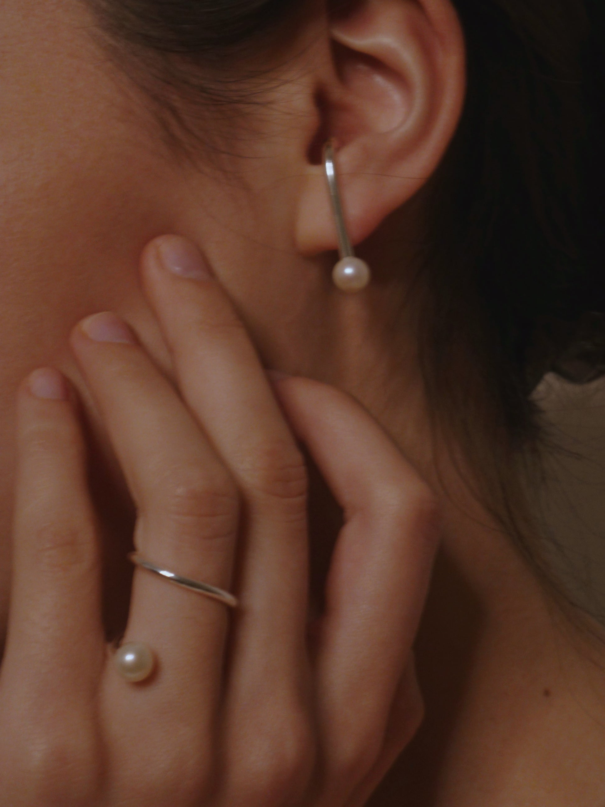 Line earrings with pearl that can be worn in a few different and unique ways. Part of a collection inspired by Croisière by A. Calder, it reflects the interplay of spheres, curves, and the interconnectedness of its elements.